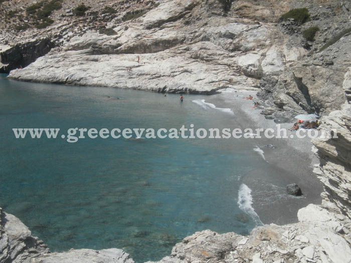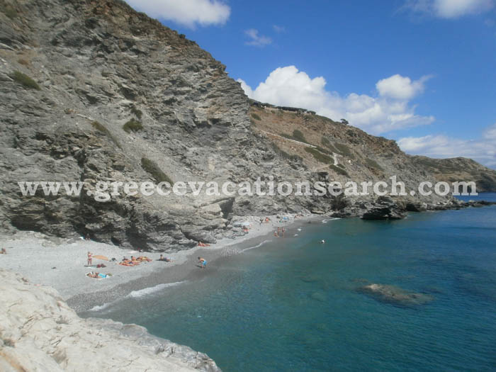 - Mouros (Southwest Amorgos): An idyllic and pretty unusual beach as the sand and pebble have a gray color while the rocks around the beach are white. The view of the beach from high above impresses visitors and the blue crystal water of the sea make the - tiresome but short - climbing up and down worth the effort. Access to the stairs that lead down to the beach is easy (there is also a bus stop here) while there is also a cafe / snack bar in the parking lot. Inside the sea the are several large rocks from which you can take a dive into the sea. At one side of the beach there are some caves, while there are also a couple of underwater caves as well.