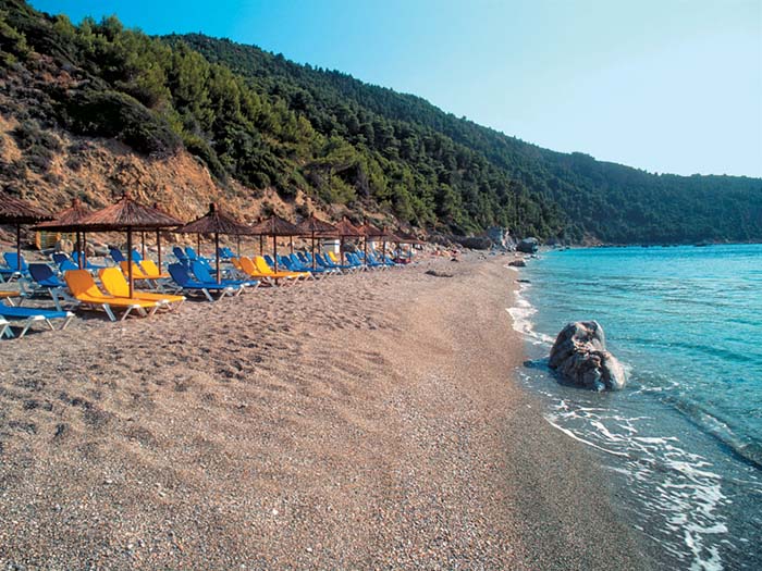 - Limnonari (South Skopelos): This beach is at the south side of Skopelos, close to Agnontas village, surrounded by green hill-sides. The beach is rather long and it has thin white sand, calm turquoise water, sunbeds, umbrellas and a few taverns.
